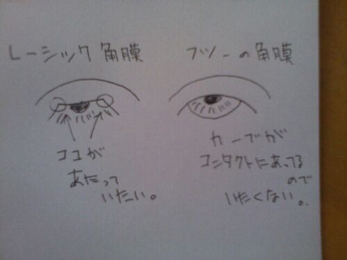 レンコンです。 知人情報ですが、レーシック術後用コンタクトが発売されているようです。ハードコンタクトだそうです。お値段は一枚二万五千円−3万円程度なりつまり両眼で5万円ってことですか。消費税はかかるのだろうか?レーシック難民にはぶっ倒れそうな…